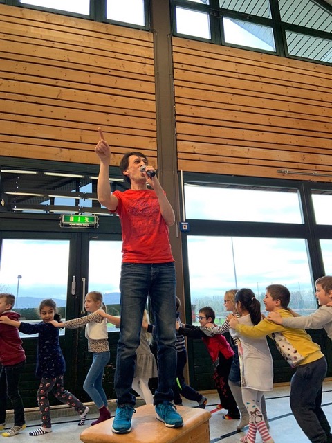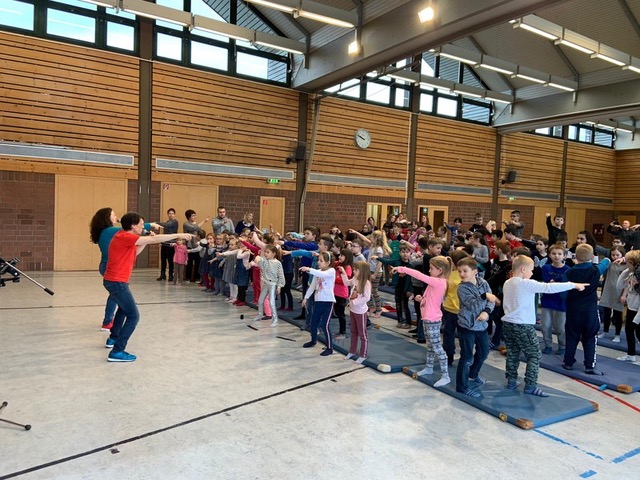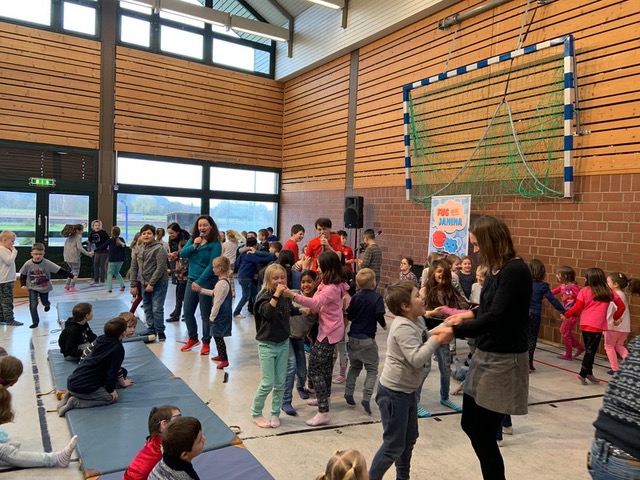 In den vergangenen Wochen hatten die Herzbergkinder in den Klassen schon einige Lieder angehört und den ein oder anderen Favouriten gefunden. Das heutige Programm startete mit "La cancion del Cumpleanos" und "Die besten Freunde". Sofort hatten die beiden Kinderstars das Publikum gepackt und zum Mitmachen animiert. Das Lied "Matschepfütze" brachte dann immer mehr Kinder zum Tanzen und Singen bis zur "Achterbahn" schließlich eine Polonaise mit allen Kindern und Lehrern durch die Schule tanzte.