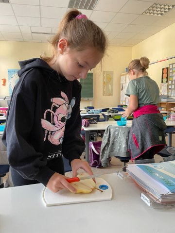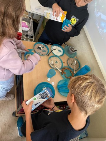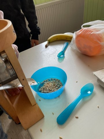 Am Freitag war es dann soweit: alle Kinder hatten ihr Lieblingsobst mitgebracht und Frau Hundur mehrere Zutaten wie Chiasamen, Mandeln, Kokosflocken und Sonnenblumenkerne sowie Milch und Hafermilch organisiert. Mit Begeisterung quetschten sich die Kinder ihre Haferflocken aus frischen Haferkörnern und kreierten ihr gesundes Frühstück. Beim Verzehr gab es dann noch zwei kleine Filme zum Thema "Getreide" über die Leinwand- und es wurde der weitere Unterrichtsverlauf besprochen. In den koomenden Wochen wollen wir auf jeden Fall noch Mehl mit der Getreidemühle herstellen und Brotwaren aus verschiedenen Mehlsorten backen. Und vielleicht finden wir ja noch einen echten Bäcker, bei dem wir mal über die Schulter schauen und etwas über sein Handwerk lernen können! Wir werden euch davon berichten!!