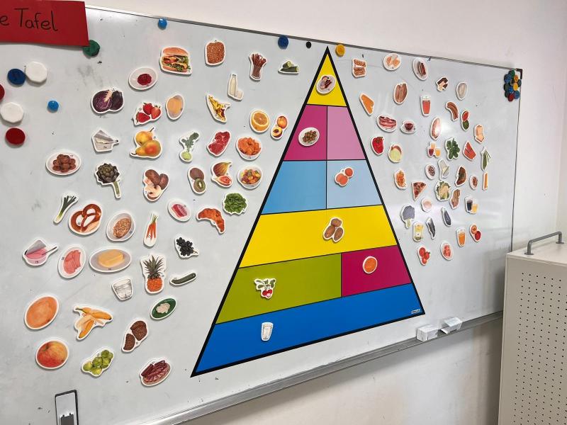Bevor es aber an das praktische Ausprobieren ging, erarbeiteten die Fledermäuse die verschiedenen Komponenten des täglichen Essens anhand einer Ernährungspyramide mit vielen Magneten.